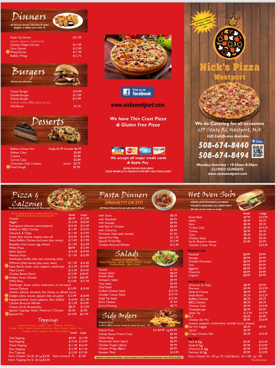 Welcome to Nick's Pizza - Westport, where deliciousness meets comfort! Located at 655 State Rd in Westport, MA, this pizzeria is a treasure for pizza lovers. Their extensive gluten-free menu features a range of mouth-watering offerings, from the savory Breakfast Pizza to the indulgent Chick Brocc Alfredo Pizza. Each pizza is crafted with care, ensuring that whether you choose the spicy Buff/BBQ Pizza or the vibrant Greek Pizza, you’ll savor every bite.
